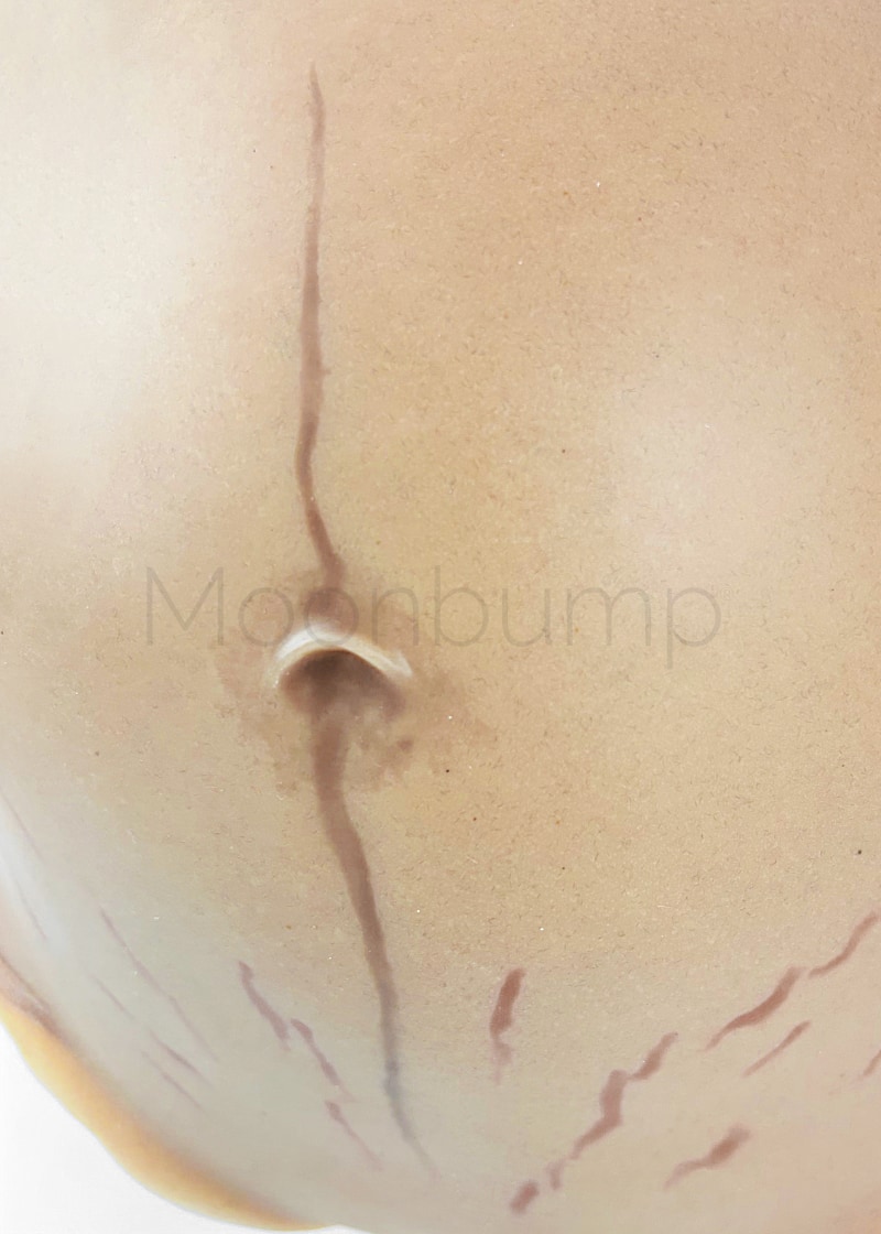 • . Original Moonbump® fake pregnancy belly in size 5-6 months (22 to 30 weeks, 2nd trimester) and silicone colour M5 (warm beige). Customisable with a choice of hand-painted linea nigra (pregnancy line), stretch marks and colour matching.