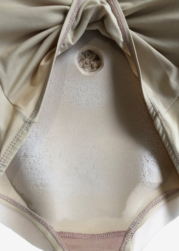 The inside surface of our Silicone Fake Pregnant Belly is composed of silicone, soft polyurethane foam and fabric. Some silicone and foam may overhang the fabric bodysuit on one or both sides at the top and bottom edges of the bump shape and the silicone and foam layers are not adhered to one another. Our Silicone Fake Pregnant Bellies have a soft foam core and often some of the foam is pressed through the fabric bodysuit to the other side during the making process, along with a round shallow hole on the inside surface of the shape which is a natural result of the making process. These are normal features of our Silicone Moonbumps that are not visible during use, and do not affect the wearability or appearance of the Moonbumps when worn. After some initial use the silicone layer sometimes comes away slightly at the edges of the bodysuit as the fabric stretches and retracts, however this should settle over time and should not cause any wearability problems.